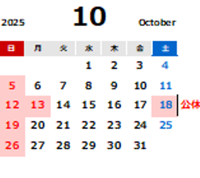 10月の定休日は、13日㈪・18㈯・日曜・祝日です。