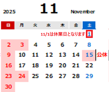 11月の定休日は、1日㈯・3日㈪・15日㈯・24日㈪・日曜・祝日です。