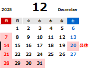 12月の定休日は、6日㈯※12時までの営業・20日㈯・27日㈯※12時まで営業・28日㈰~1月4日㈰・日曜・祝日です。