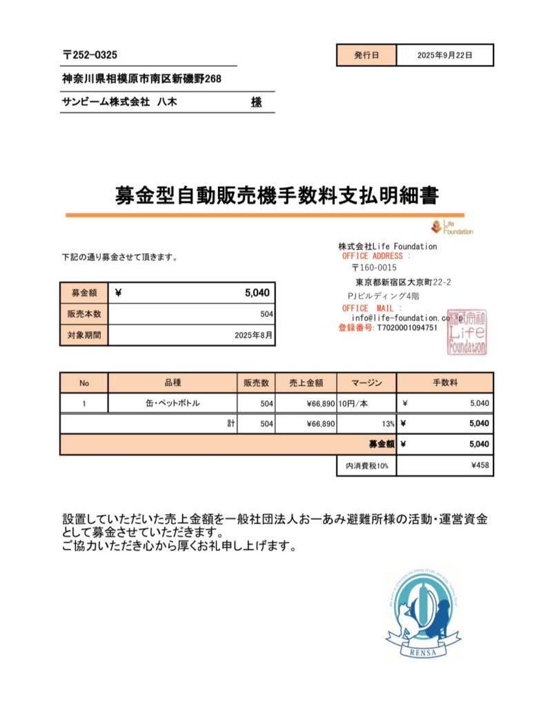横浜市青葉区にあります、東日本大震災で取り残された多くのペットを保護してきた、現在は全国から行き場のなくなった犬猫、約100頭を一軒家で保護する「おーあみ避難所」へ寄付されます。