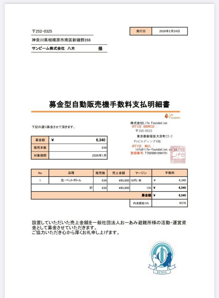 チャリティー自販機1月募金額のお知らせ